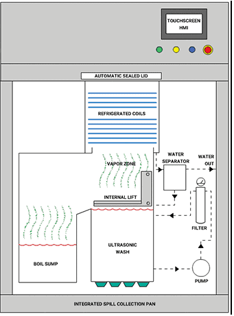 Pokrywa kompresyjna Solvac z automatycznym uszczelnieniem zatrzymuje rozpuszczalnik, zwiększając wydajność. Elektroniczny system modulacji impulsów Vapotronic wysyła elektryczną energię cieplną do rozpuszczalnika tylko wtedy, gdy jest to potrzebne, zamiast do mniej wydajnych maszyn, zmniejszając koszty energii elektrycznej.